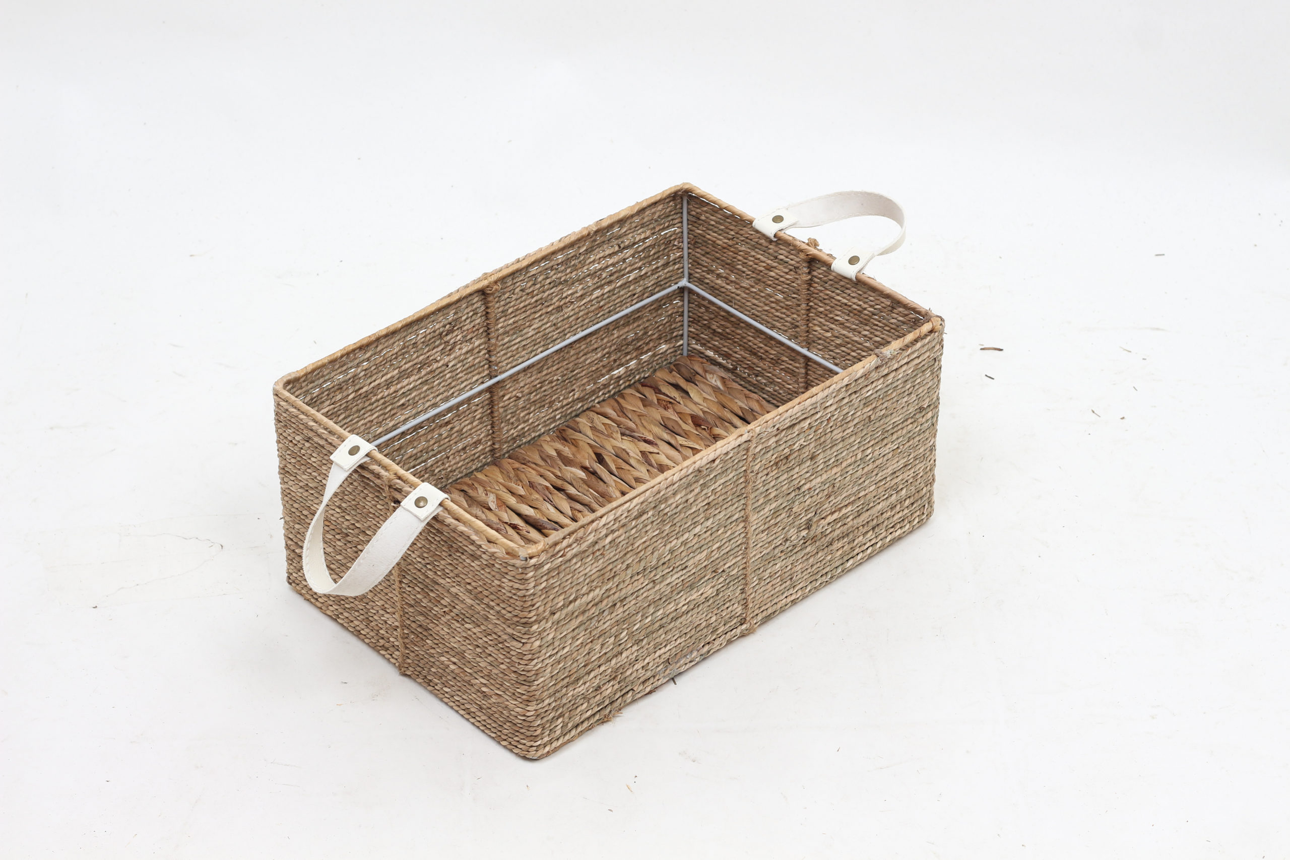 Natural rectangular seagrass kitchen organizer with leather handles also pantry basket and toy storage organizer from Vietnamese supplier