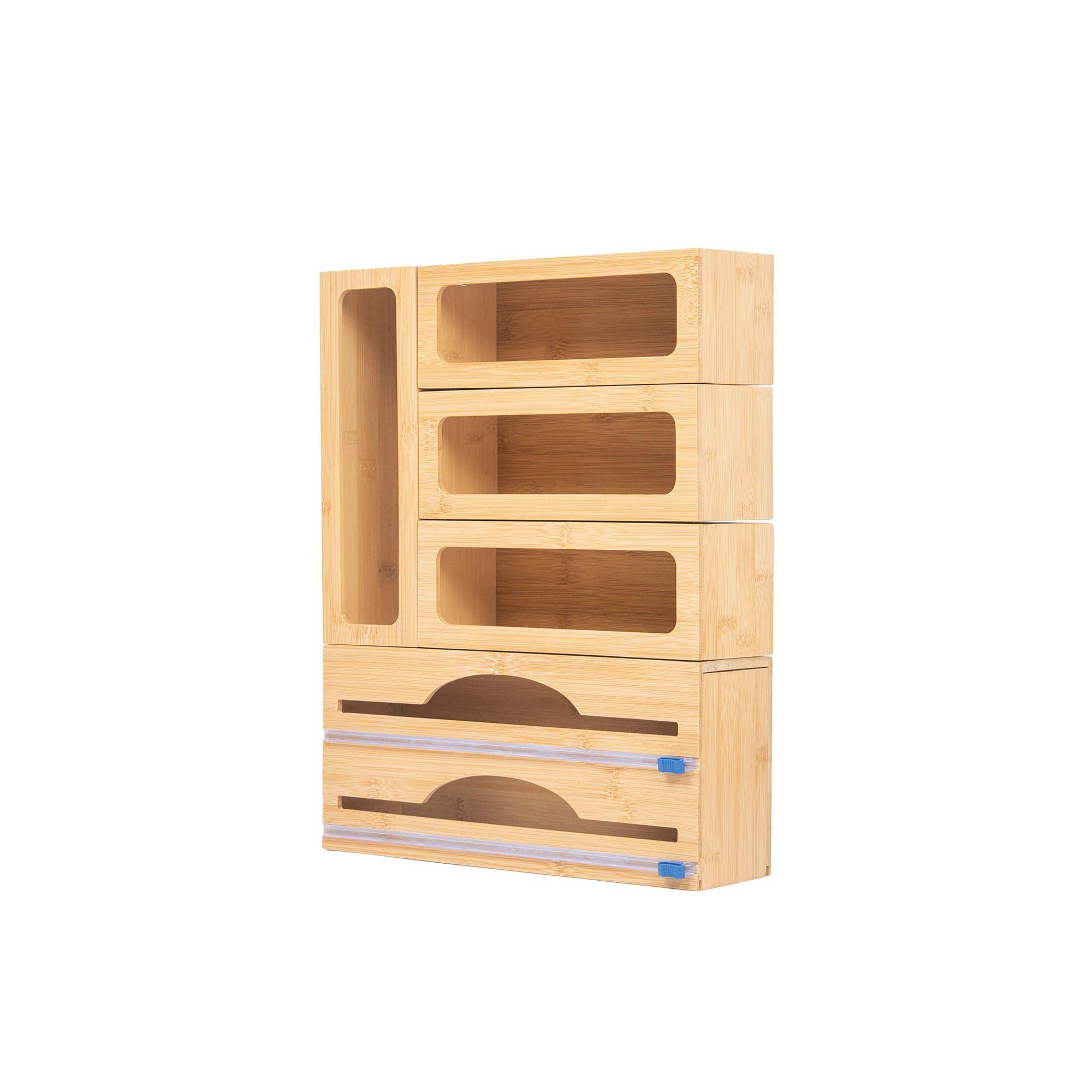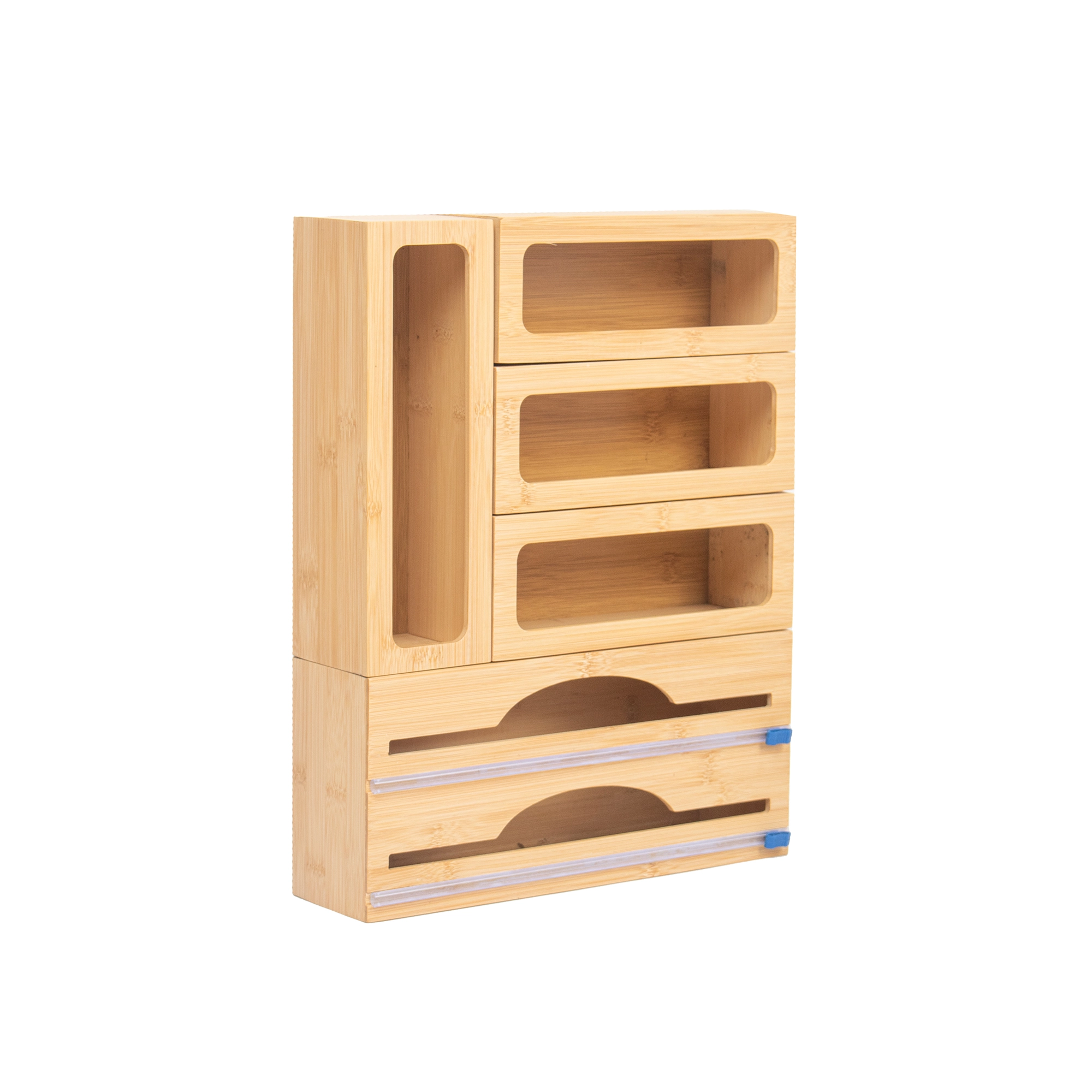 Wholesale Bamboo Foil and Plastic Wrap Organizer FSC Kitchen Drawer Food Storage Bag Holder with Engraved Labels for Home, Office, HORECA and Retail Stores
